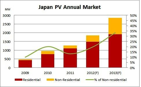 根據(jù)市場研究機(jī)構(gòu)NPD Solarbuzz出版的亞太地區(qū)太陽能發(fā)電市場季報,受益于2012年7月頒布的全國上網(wǎng)電價政策,日本太陽能發(fā)電市場安裝量迅速成長,其中非住宅項目比例快速提高,預(yù)計到2013年將首次超過30%。