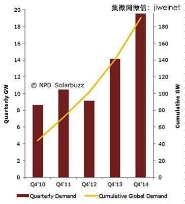 太陽能市場研究機構 NPD Solarbuzz 估計, 2014年第四季全球太陽能新增安裝量有可能達到19.5GW,推動全球累計太陽能安裝量向200 GW邁進;第四季安裝的太陽能發(fā)電能力合計相當于五個大型核電站,并且將超過2010年的全年安裝總量。 根據(jù)NPD S