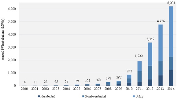 2015年3月10月,GTM Research與美國太陽能產(chǎn)業(yè)協(xié)議(SEIA)聯(lián)合發(fā)布一份名為《2014年美國太陽能市場回顧》的研究報告。報告聲稱,2014年,美國新增光伏裝機容量創(chuàng)下歷史新高,高達6201兆瓦,較2013年增長30%。