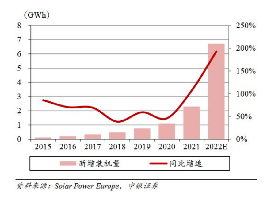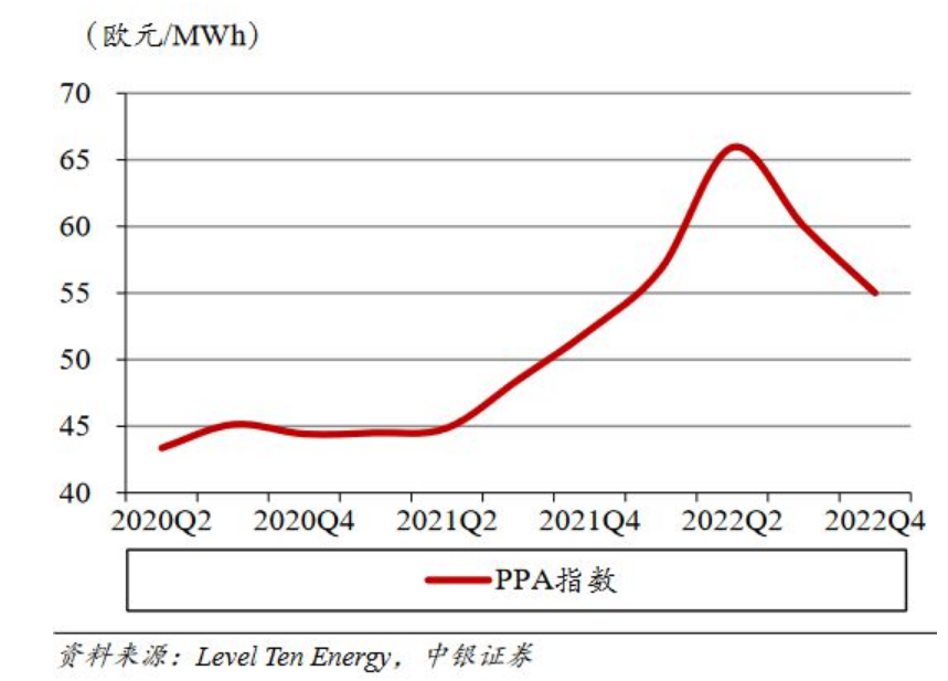 2022年以來,受到地緣沖突下各國相互制約的影響,歐洲陷入能源緊缺局面,天然氣價格高位運行帶動電價快速上漲,根據(jù)可再生能源交易基礎(chǔ)設(shè)施提供商Level Ten Energy的數(shù)據(jù),2022年可再生能源購電協(xié)議新簽價格最高超過65歐元/MWh,相比往年約45歐元/MWh的價格中樞有明顯漲幅,高電價使得2022年歐洲戶儲裝機(jī)躍升。圖:歐洲PP