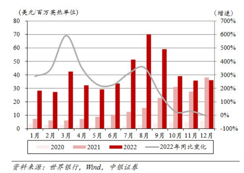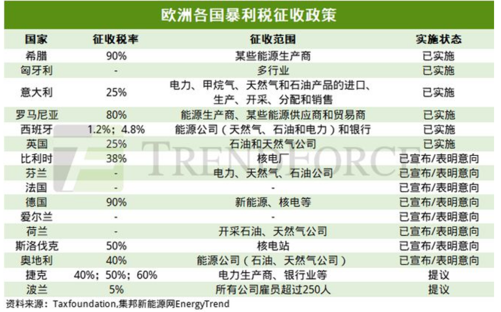 2022年以來,受到地緣沖突下各國相互制約的影響,歐洲陷入能源緊缺局面,天然氣價格高位運行帶動電價快速上漲,根據(jù)可再生能源交易基礎(chǔ)設(shè)施提供商Level Ten Energy的數(shù)據(jù),2022年可再生能源購電協(xié)議新簽價格最高超過65歐元/MWh,相比往年約45歐元/MWh的價格中樞有明顯漲幅,高電價使得2022年歐洲戶儲裝機(jī)躍升。 ![]() 圖:歐洲PPA電價 高電價促使歐洲戶用儲能新增裝機(jī)翻倍增長 在此背景下,得益于高電價差帶來的經(jīng)濟(jì)性提升,歐洲戶用光儲系統(tǒng)經(jīng)濟(jì)性大幅提升,我們在0.6歐元/kWh的居民電價水平下測算(假設(shè)貸款比率50%,貸款利率3.60%,光伏系統(tǒng)成本2.50歐元/W,儲能系統(tǒng)1.00歐元/W,不考慮峰谷價差),戶用光儲系統(tǒng)IRR可達(dá)到18.52%,投資回報周期約5.04年,項目經(jīng)濟(jì)性明顯且優(yōu)于純光伏系統(tǒng),若進(jìn)一步考慮峰谷價差,戶用光儲系統(tǒng)經(jīng)濟(jì)性則還有望進(jìn)一步提升。 因此,歐洲戶用儲能市場規(guī)模在2022年開啟翻倍式增長,在2021年新增裝機(jī)約2.29GWh的基礎(chǔ)上,預(yù)計2022年歐洲有望實現(xiàn)接近7GWh的新增戶儲裝機(jī),同比增長近200%。 ![]() 圖:歐洲戶用儲能新增裝機(jī)量 采取緊急市場干預(yù),歐洲政府征收“暴利稅”干預(yù)電價 為限制電價無節(jié)制上漲,歐洲政府采取行動限制電價,2022年9月歐盟發(fā)布緊急干預(yù)能源價格預(yù)案。暴利稅是針對特定行業(yè)或公司的超高利潤征收較高的稅率,目的是重新分配某領(lǐng)域的超額利潤,為社會公益籌集資金。 為應(yīng)對能源危機(jī),歐盟已同意對能源公司征收暴利稅,具體實施方案將由各成員國自行決定。截至2022年12月,歐洲已有16個國家地區(qū)推進(jìn)暴利稅征收政策。 ![]() 圖:歐洲各國暴利稅征收稅率 天然氣價格下行,歐洲批發(fā)電價回落 當(dāng)前,隨著天然氣價格下行,帶動歐洲批發(fā)電價暫時回落,但天然氣供需關(guān)系或許導(dǎo)致氣價無法長期維持低位。自2022年9月以來,根據(jù)世界銀行數(shù)據(jù)顯示,歐洲天然氣價格從70.04美元/百萬英熱單位的峰值進(jìn)入下降通道,2022年12月,其價格已降至36.04美元/百萬英熱單位,但仍是2020年同期天然氣價格的6倍有余。 ![]() 圖:2020-2022年歐洲天然氣商品價格 |