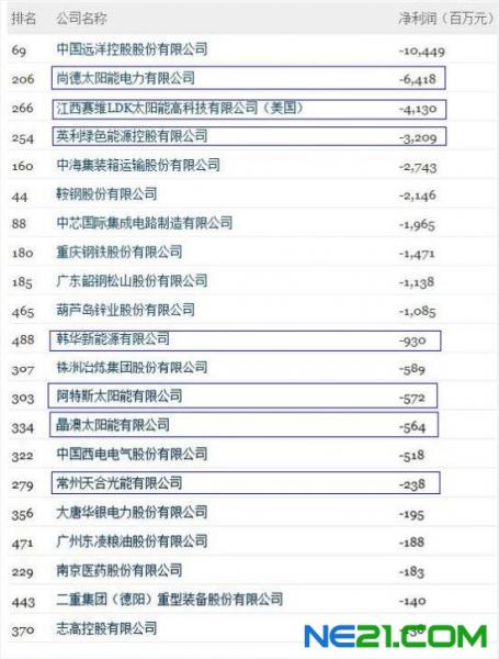 《財富》今日公布了2012年度中國500強名單,同時公布了2012年中國500強虧損公司。2012年中國500強共有21家虧損公司,中國遠洋控股虧損最為嚴重,緊隨其后的連續(xù)三名虧損企業(yè)都是光伏企業(yè),7家新能源企業(yè)累計虧損160.61億元。