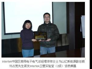 2013年12月26日--ntertek天祥集團(tuán)(以下簡稱Intertek)授予山億新能源股份有限公司(以下簡稱山億新能源)“衛(wèi)星計劃”實驗室資質(zhì)。Intertek中國區(qū)商用電子電氣總經(jīng)理李瓊和山億新能源副總裁劉占寬出席了授牌儀式。