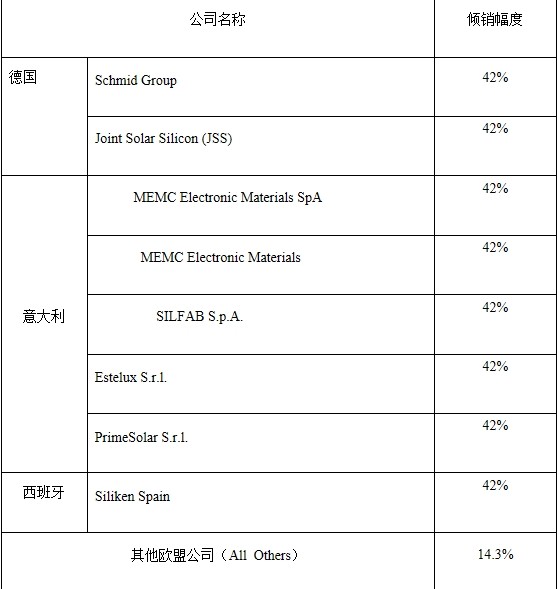 根據(jù)《反傾銷條例》的有關(guān)規(guī)定,調(diào)查機關(guān)向國務(wù)院關(guān)稅稅則委員會提出對原產(chǎn)于歐盟的進口太陽能級多晶硅征收反傾銷稅的建議。國務(wù)院關(guān)稅稅則委員會根據(jù)調(diào)查機關(guān)的建議作出決定,自2014年5月1日起,對原產(chǎn)于歐盟的進口太陽能級多晶硅征收反傾銷稅。對各公司征收的反傾銷稅稅率如下: