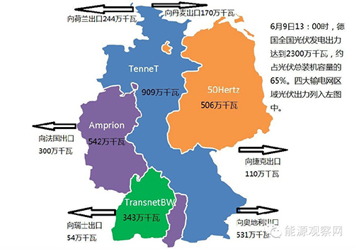 可以看出,德國光伏出力最大時,大量向荷蘭、丹麥、法國、捷克、奧地利、瑞士出口電力。這一點不難理解,德國與周邊國家通過萊比錫電力市場進(jìn)行交易。當(dāng)?shù)聡形绻夥蟀l(fā)之時,電力系統(tǒng)供應(yīng)充足,電力市場價格大幅下跌,周邊國家可以按照非常便宜的價格從德國進(jìn)口電力。以此,光伏電量是消納了,爭議和問題也就產(chǎn)生了。德國光伏是得到高額政策補(bǔ)貼的,大量電量出口德國也就意味著德國將昂貴的光伏電量廉價賣給了周邊國家【注:2012年全年有56個小時的交易電價為負(fù)】,國內(nèi)光伏補(bǔ)貼也就隨之流出國外。但筆者認(rèn)為,盡管光伏發(fā)電與出口電量存在明顯的正相關(guān)性,但光伏上網(wǎng)之后就無法分辨出是光伏電還是煤電,所以,將出口電量視為光伏電量,似乎也有不妥。此為后話,這里暫且不論。