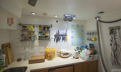 PlanetSolar上的鋰離子電池總重為8.5噸,需要兩天時(shí)間才能充滿電,但充滿電之后能在沒(méi)有陽(yáng)光的情況下保證游艇3天的正常航行。PlanetSolar的外部照明控制面板。