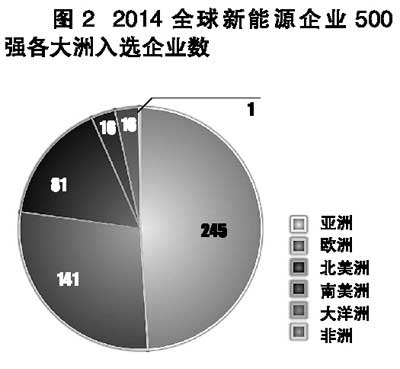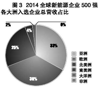 球新能源企業(yè)“500強(qiáng)”亞洲入選企業(yè)的總營收額為9219億元,占“500強(qiáng)”總營收額的33%(見圖3),比2013年的8643億元(占 30.5%)增加了576億元;而2014歐洲入選企業(yè)的總營收額為1015億元,占“500強(qiáng)”總營收額的36%,比2013年的1037億元(占 36.7%)減少了22億元。