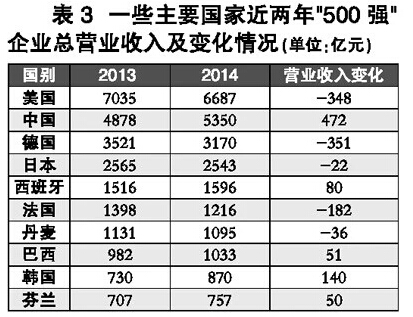 規(guī)模來(lái)說(shuō),中國(guó)雖然仍大幅低于美國(guó),但是差距正逐步減小。更值得注意的是, 2014“500強(qiáng)”中國(guó)企業(yè)總營(yíng)業(yè)收入比2013增加了472億元(見(jiàn)表3),而相反的是,美國(guó)企業(yè)的總營(yíng)業(yè)收入?yún)s減少了348億元,中國(guó)企業(yè)與美國(guó)企