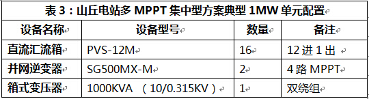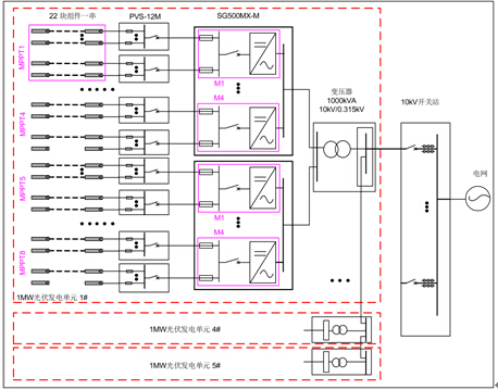 三、山丘電站光伏逆變器選型實(shí)例 山丘電站地處山地或丘陵,地勢(shì)起伏,一般規(guī)模較大,并入輸電網(wǎng),綜合前期組件鋪設(shè)的選址規(guī)劃,推薦選用多MPPT集中型逆變器,即具有多路MPPT功能的集中型逆變器;在非常復(fù)雜的山丘地形中,如實(shí)現(xiàn)100KW組件同一朝向鋪設(shè)難度大,可以考慮組串型方案。以1MW單元為例,典型的山丘電站多MPPT集中型方案配置和系統(tǒng)圖如下: