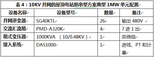 四、屋頂電站光伏逆變器選型實(shí)例 建筑屋頂結(jié)構(gòu)復(fù)雜,多存在遮擋和朝向不一致情況,推薦選用組串型逆變器;有的工業(yè)廠房屋頂是彩鋼材質(zhì),承重有限,也可以選用集中型方案。以1MW單元為例,典型的10KV并網(wǎng)的屋頂電站組串型方案配置和系統(tǒng)圖如下: