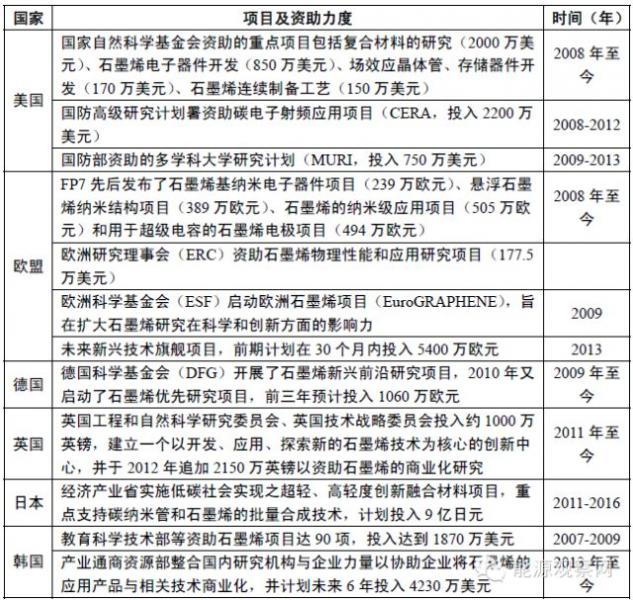 各國石墨烯戰(zhàn)略? 各國政府紛紛亮出“商業(yè)化時間表”?v觀各國石墨烯技術研發(fā)布局,均以產業(yè)化為導向,大量研發(fā)項目都制定了嚴格的“商業(yè)化時間表”,充分考慮商業(yè)化前景,合理安排商業(yè)化應用時間進度。2013 年1 月,石墨烯入選歐盟兩項“未來和新興技術旗艦項目”之一(另一項為“人類大腦工程”),歐盟委員會計劃在未來十年投入10 億歐元開展石墨烯應用技術研發(fā)與產業(yè)化。世界主要國家開展石墨烯相關的研發(fā)項目與資助情況如下表所示。