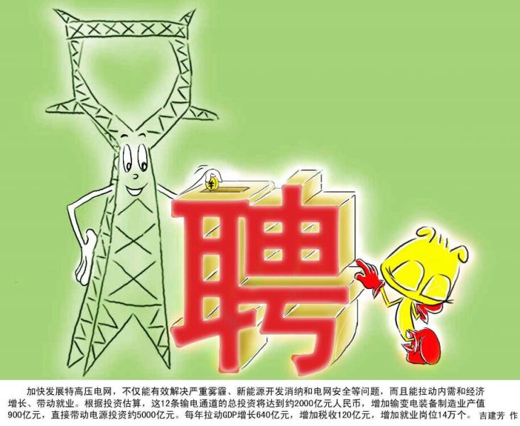 發(fā)展特高壓電網(wǎng),對拉動內(nèi)需和經(jīng)濟增長、帶動裝備制造業(yè)轉(zhuǎn)型升級、促進東西部協(xié)調(diào)發(fā)展、帶動就業(yè),發(fā)揮著重要作用。根據(jù)投資估算,大氣污染防治行動計劃重點輸電通道總投資將達到約2000億元,增加輸變電裝備制造業(yè)產(chǎn)值900億元,直接帶動電源投資約5000億元。每年拉動GDP增長640億元,增加稅收120億元,增加就業(yè)崗位14萬個。