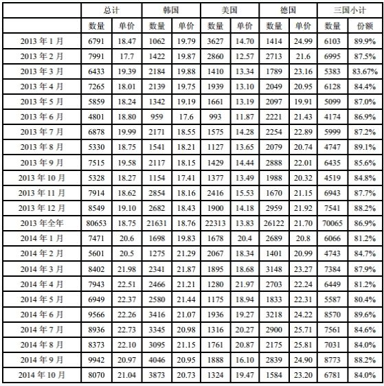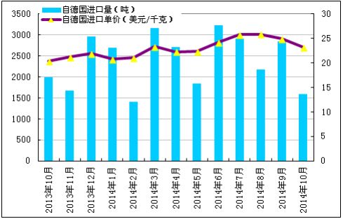 2014年10月份從德國進(jìn)口多晶硅量大幅降至1584噸,環(huán)比降幅為44.2%;10月進(jìn)口單價(jià)小幅下滑至23.20美元/千克,環(huán)比降幅為6.83%。