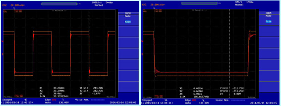 。9)215V低上升斜率方波(上升時(shí)間約為2毫秒)的表現(xiàn)。右圖為放大后的細(xì)節(jié)圖。表現(xiàn)良好。