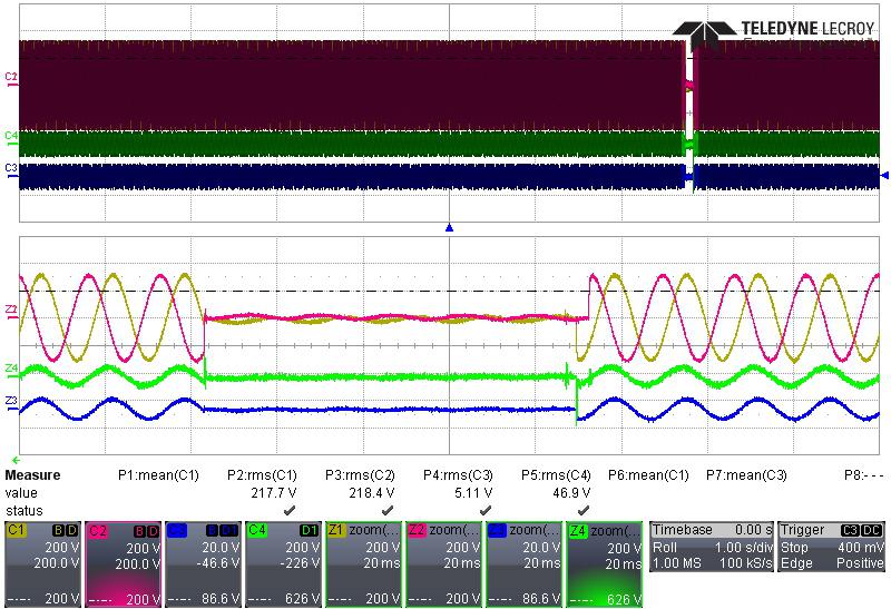 其中黃色軌跡為A相電壓,紫色軌跡為B相電壓,綠色軌跡為A相電流,藍(lán)色軌跡為RTDS控制A相電壓的信號。