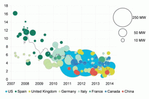 來(lái)源:彭博新能源財(cái)報(bào)告 氣泡大小代表項(xiàng)目的兆瓦規(guī)模