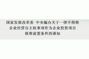 根據(jù)《國務(wù)院辦公廳關(guān)于印發(fā)精簡審批事項(xiàng)規(guī)范中介服務(wù)實(shí)行企業(yè)投資項(xiàng)目網(wǎng)上并聯(lián)核準(zhǔn)制度工作方案的通知》(國辦發(fā)〔2014〕59號)要求,對于屬于企業(yè)經(jīng)營自主權(quán)的事項(xiàng),一律不再作為企業(yè)投資項(xiàng)目核準(zhǔn)前置條件,并要求2014年底前公布取消,F(xiàn)將有關(guān)事項(xiàng)通知如下: