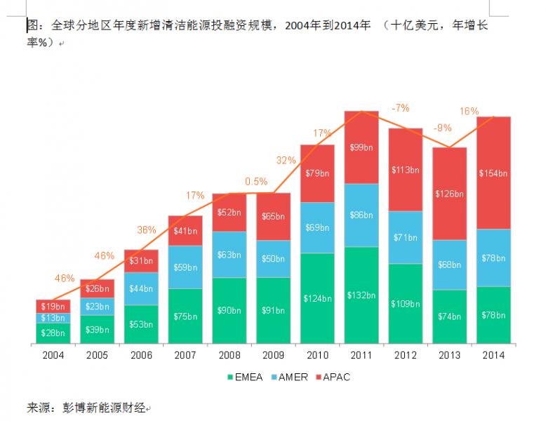 彭博新能源財(cái)經(jīng)(BNEF)近日發(fā)布年度數(shù)據(jù)報(bào)告稱,2014年全球清潔能源投資總額達(dá)到3100億美元,相較2013年的2681億美元增長了16%,較2004年的602億美元增長逾5倍,但與2011年的歷史最高記錄3175 億美元相比仍低 2%。2014年,全球風(fēng)能和太陽能新增裝機(jī)容量均創(chuàng)下歷史紀(jì)錄,總規(guī)模
