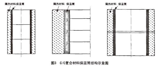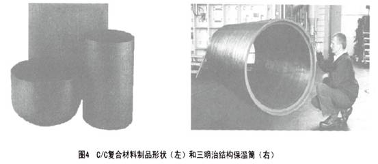 C/C復(fù)合材料還可以用來制造熱反射屏(筒)、上/下保溫蓋、防漏盤、螺栓、螺帽等配件,使熱場材料幾近石墨和C/C復(fù)合材料化。圖4是C/C復(fù)合材料制品和三明治結(jié)構(gòu)的保溫筒。