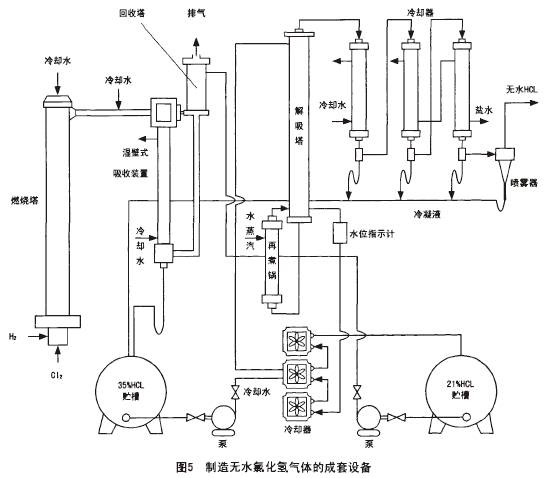 -5,這就需用干燥的氯化氫來(lái)進(jìn)行純化處理。圖5是制造無(wú)水氯化氫的整套工藝流程圖。純化是基于在高溫下金屬雜質(zhì)與氯化氫生成低沸點(diǎn)氯化物而揮發(fā)逸走,使石墨化得到純化。此外,也可采用氯氣純化。