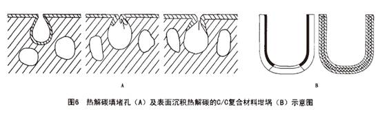 因此,C/C坩堝表面要進(jìn)行熱解碳沉積而填堵孔。圖6是熱解碳填堵孔及表面沉積熱解碳的C/C復(fù)合材料坩堝的示意圖;瘜W(xué)氣相沉積熱解碳的速度要慢,控制在0.2μm/h,沉積厚度為2μm熱解碳約需100h。