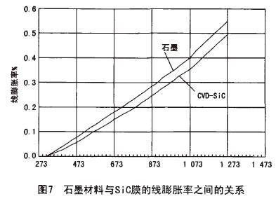 C/C坩堝除用CVD法沉積熱解碳外,也可用沉積SiC層。SiC層不僅可填堵表面的孔,而且可緩和它們之間的熱膨脹率之差而引起應(yīng)力導(dǎo)致熱龜裂。硅在液相的密度要比固相大,熔融或冷卻過(guò)程中自身要發(fā)生熱脹冷縮,而碳的膨脹系數(shù)要比硅小得多,使在升溫或降低過(guò)程中緩解熱應(yīng)力。因?yàn)镾iC的線膨脹隨溫度變化規(guī)律與石墨材料相一致,如圖7所示。