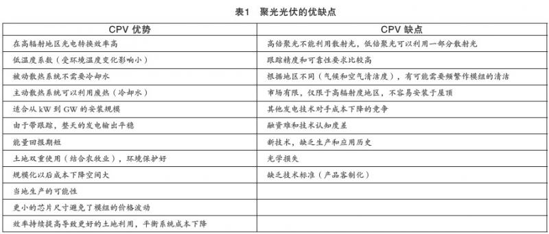 一些分析報(bào)告還顯示,自從進(jìn)入光伏市場(chǎng)以來(lái),高倍聚光系統(tǒng)的安裝成本在持續(xù)下降。 2013年,F(xiàn)rauhofer ISE 的一份報(bào)告發(fā)現(xiàn),安裝10MWp的高倍聚光項(xiàng)目,價(jià)格在 1.4歐元到 2.2 歐元每瓦。價(jià)格變化是因?yàn)椴捎貌煌募夹g(shù)路線和新的不同安裝地點(diǎn)造成的差異,基于這些項(xiàng)目計(jì)算得到的平準(zhǔn)化電力成本(LCOE)為0.1歐元/度到0.15歐元/度(對(duì)應(yīng)的輻射度DNI =2000 kWh/m2/a)和0.08歐元/度到0.12歐元/度(對(duì)應(yīng)的輻射度DNI =2500 kWh/m2/a)。高倍聚光的優(yōu)缺點(diǎn)見表1。