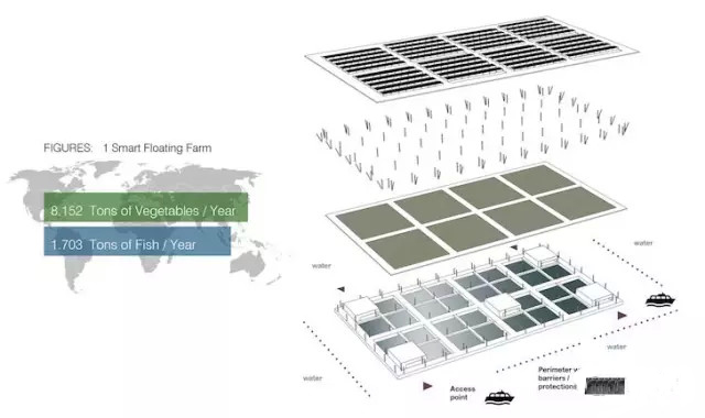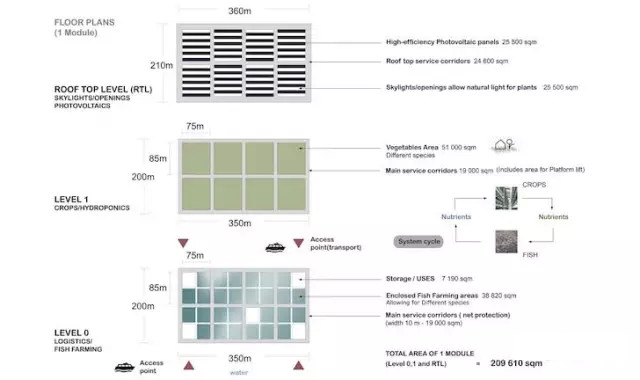 SFF模塊包括三個(gè)層面:用于水產(chǎn)養(yǎng)殖和海水淡化技術(shù)的底層;栽培水培作物的第一層;屋覆蓋了太陽(yáng)能電池板、天窗和雨水收集器的頂層。通過(guò)使用可靈活組合、堆疊的模塊化系統(tǒng),SFF的可擴(kuò)展性、適應(yīng)性、資源的有效利用率都非常強(qiáng)。每個(gè)模塊預(yù)計(jì)將每年生產(chǎn)8152噸蔬菜和1703噸魚(yú)。