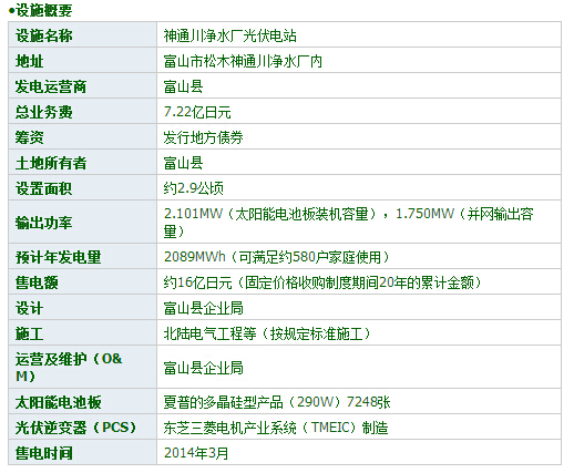 2014年3月,富山縣企業(yè)局在水力發(fā)電之外,又運營了首個光伏電站。這就是輸出功率1.75MW的“神通川凈水廠光伏電站”(圖1)。在停業(yè)的神通川凈水廠(富山市松木)內(nèi),鋪設了7248張?zhí)柲茈姵匕。年發(fā)電量預計為208.9萬kWh,相當于580戶家庭的用電量。建設費用為7.22億日元。利用固定