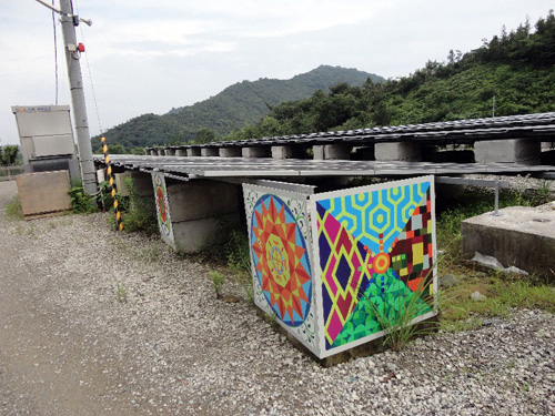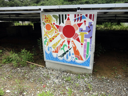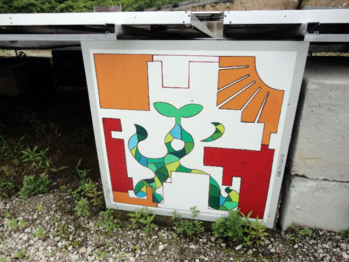 一進(jìn)發(fā)電站,首先映入眼簾的是混凝土預(yù)制塊基礎(chǔ)上色彩鮮艷的繪畫。這是香川縣立高松工藝高中設(shè)計(jì)科的學(xué)生們以太陽為題材的畫作。在約1m見方的鋁板上,烙刻上了學(xué)生們設(shè)計(jì)的作品。畫的右下角還有作者的名字。畫作覆蓋了發(fā)電站內(nèi)通路的混凝土預(yù)制塊共計(jì)39幅,為單調(diào)的光伏電站增添了色彩(圖3、圖4、圖5、圖6)。