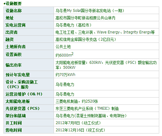 電機(jī)產(chǎn)業(yè)系統(tǒng)(TMEIC)制造,高壓變壓器采用三菱電機(jī)的產(chǎn)品。太陽能電池板由三菱電機(jī)制造,架臺(tái)由電工社工程設(shè)計(jì)制造。