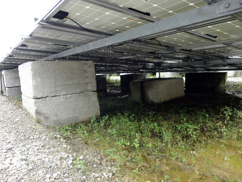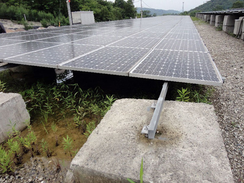 該發(fā)電站購買的長寬各1m、高50cm、重量為2噸的“豆腐”,每個(gè)2500日元。以在其上鉆孔,利用化學(xué)膠粘劑將鋼棍固定其中的“粘合錨栓”方法,固定了架臺(tái)的螺絲。采用縱6張電池板的大面積陣列(電池板的安裝單位),設(shè)置角度為5度。支撐上部附近的基礎(chǔ)為兩個(gè)“豆腐”疊放,中部和下部附近的基礎(chǔ)用一個(gè)“豆腐”支撐,由此形成了5度的傾斜角度(圖8)。
