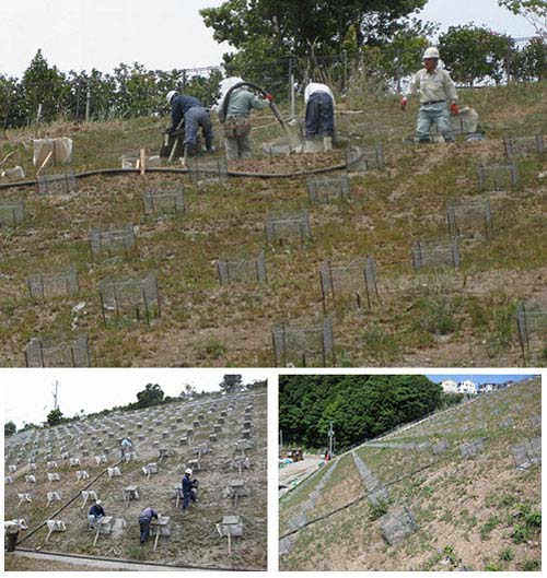 基礎(chǔ)是以噴漿形成的(圖6)。這種施工方法常見于削山后加固山體的工程。用砂漿覆蓋住斜坡的表面,具有防止巖石和沙土流失的效果。