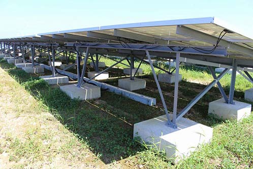 最初也考慮過采用沿東西方向形成長條狀混凝土的“連續(xù)基礎(chǔ)”(圖5)。但考慮到難以吸收陣列橫向的凹凸及施工效率和成本等,而采用了“獨立基礎(chǔ)”。為了提高拉拔應力,采用了將樁子砸到混凝土基礎(chǔ)下方土地中的構(gòu)造。