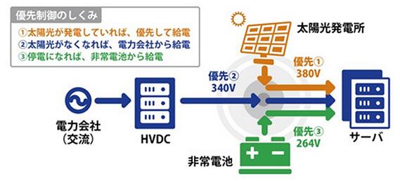 這三種電源,越優(yōu)先使用的電源,設定的電壓越高。因此,據(jù)稱即使不主動控制電源選擇,也會按照光伏電力商用電力蓄電池的優(yōu)先順序,自動從集中電源裝置向服務器供電。