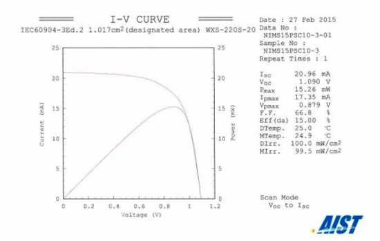 圖5. 日本AIST認證結(jié)果,電池面積1.017cm2