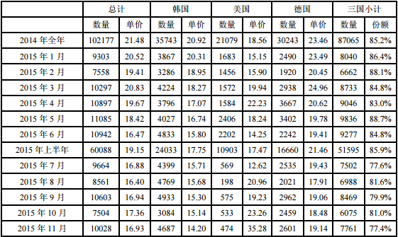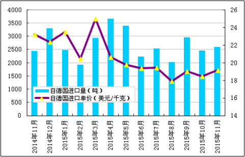 2015年11月份從德國進(jìn)口多晶硅量為2601噸,環(huán)比增加5.8%;11月份進(jìn)口單價(jià)為19.14美元/千克,環(huán)比增幅為3.6%。