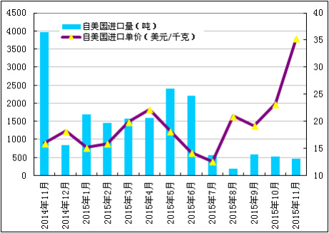 2015年11月份從美國進(jìn)口多晶硅量為474噸,環(huán)比降幅為11.1%;11月份進(jìn)口單價(jià)大幅上漲至35.28美元/千克,環(huán)比增幅為51.7%。