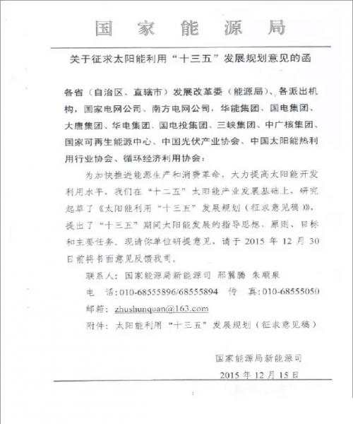 國家能源局于12月15日向各。ㄗ灾螀^(qū)、直轄市)發(fā)改委能源局等有關(guān)部門下發(fā)《太陽能利用十三五發(fā)展規(guī)劃征求意見稿》(簡稱意見稿),要求于12月30日前將書面意見反饋至國家能源局新能源司。 該意見稿內(nèi)容涵蓋光伏發(fā)電、光熱發(fā)電和太陽能熱利用三個產(chǎn)業(yè)的十三五發(fā)展規(guī)劃意見,其正式提出,到2020年底,要實現(xiàn)太陽能熱發(fā)