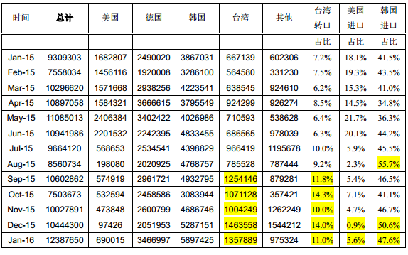 2015年9月份以前,中國自臺灣進(jìn)口多晶硅量從未達(dá)到千噸,且大部分時間在總進(jìn)口量中的占比都在5%-10%之間,但是從9月份開始,從臺灣進(jìn)口多晶硅量持續(xù)維持在千噸以上,其中12月份從臺灣進(jìn)口量高達(dá)1464噸,占比同樣高達(dá)14.0%,已經(jīng)超過半年連續(xù)位居我國第三大進(jìn)口地區(qū)。正是由于通過臺灣進(jìn)口規(guī)避“雙反”征稅的方式已經(jīng)逐漸成為主流,所以即便美國進(jìn)口量大幅減少,但自美國和臺灣進(jìn)口量之和也在1500-2000噸/月左右,與美國未減少之前無異,因此限制通過臺灣轉(zhuǎn)口規(guī)避“雙反”征稅應(yīng)及時提上日程。