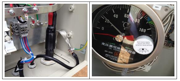 匯流箱接地線未連接到接地排上、箱變底部電纜溝未封堵、箱變事故放油未按引流管、無(wú)事故放油池、逆變器電壓表?yè)p壞、變壓器用油面溫控器內(nèi)泡沫未取出(如下圖所示):