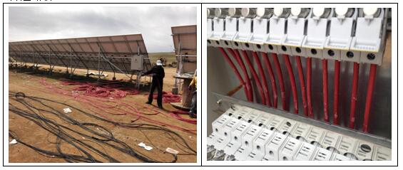 由于接線方法不合理,安裝工人在沙土地上拖拽線纜,造成匯流箱內(nèi)組串線普遍劃傷: