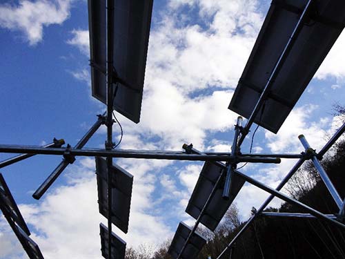 架臺由單管組合建成;A(chǔ)為螺旋樁(直徑為76.3㎜),鉆樁深度為1.6m。樁基到電池板架臺的支柱(直徑為60.5㎜)的高度為3.6m,以橫向3.5m、縱向3.75m的間隔垂直設(shè)置。安裝電池板的橫向(梁)單管(直徑為48.6㎜)附有轉(zhuǎn)桿,可以用來調(diào)整每個陣列的電池板設(shè)置角度。