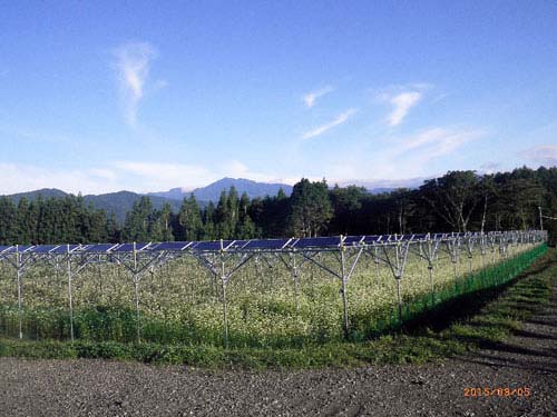 這些光伏發(fā)電設(shè)備的下面種了蕎麥。對于選擇蕎麥的理由,椎坂建設(shè)的技術(shù)顧問諸田正喜列舉了以下五點(diǎn):(1)農(nóng)業(yè)初學(xué)者容易上手,有望獲得一定的產(chǎn)量;(2)當(dāng)?shù)赜蟹N植蕎麥的技術(shù)指導(dǎo)員;(3)從播種到收獲的機(jī)械化程度高;(4)從種植到生產(chǎn)蕎麥粉均可自主完成,在今后可以銷售蕎麥粉,容易實現(xiàn)農(nóng)業(yè)生產(chǎn)者完成從加工到銷售全程的“農(nóng)業(yè)六次產(chǎn)業(yè)化”;(5)蕎麥花很漂亮,今后可以與老神溫泉合作開展旅游項目。