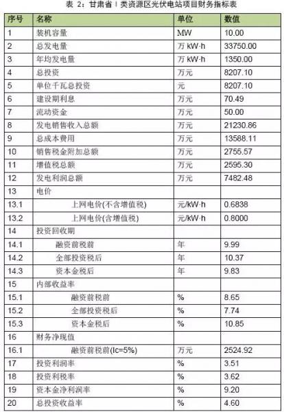 甘肅Ⅰ類資源區(qū)對應的光伏標桿電價為0.8元/kWh,假設(shè)項目裝機容量為10MW,單位造價8000元,依據(jù)以上條件測算,項目融資前稅前收益率在8.65%之間,投資回收期在9.99年之間,項目具有一定的盈利能力,但投資建設(shè)時應考慮未來光伏電價會逐步下調(diào),還應注意對資源和電網(wǎng)接入進行分析,避免限電影響,保障項目利用小時數(shù),具體見下表: