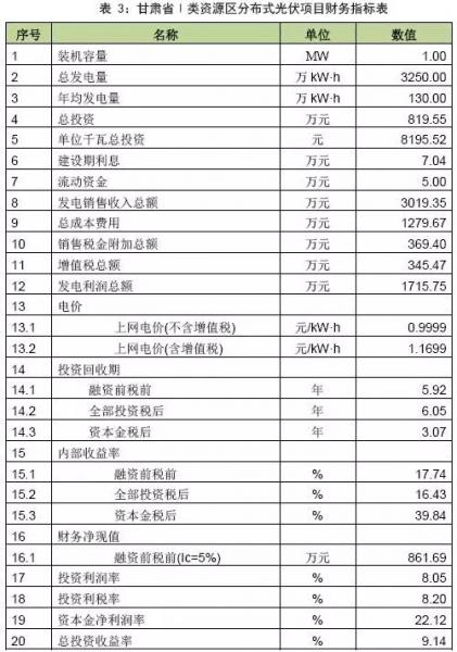 分布式光伏可選擇3種模式:如果選擇“全額上網(wǎng)”方式,對(duì)應(yīng)的光伏標(biāo)桿電價(jià)為1元/kWh;如果選擇“自發(fā)自用,余電上網(wǎng)”,所發(fā)電量國家給予0.42元/kWh的電價(jià)補(bǔ)貼,上網(wǎng)電量按照當(dāng)?shù)厝济簶?biāo)桿電價(jià)收購;選擇全部“自發(fā)自用”,電價(jià)為銷售電價(jià)和國家補(bǔ)貼之和。根據(jù)甘肅省電網(wǎng)銷售電價(jià)表,選擇由商業(yè)用電用戶投資,所發(fā)電量全部自用的模式,其電價(jià)為1.1699+0.42=1.5899元/kWh。假設(shè)項(xiàng)目裝機(jī)容量為1MW,單位造價(jià)8000元,年滿發(fā)小時(shí)數(shù)1300小時(shí)。依據(jù)以上條件測算,該項(xiàng)目融資前稅前收益率在17.74%之間,投資回收期在5.92年之間,項(xiàng)目盈利能力良好。具體見下表。