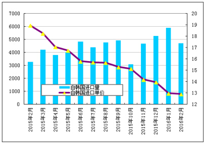 韓國: 2016年2月份從韓國進口多晶硅量為4700噸,環(huán)比減少20.3%;進口單價再創(chuàng)歷史新低至12.92美元/千克,環(huán)比下滑為5.4%。