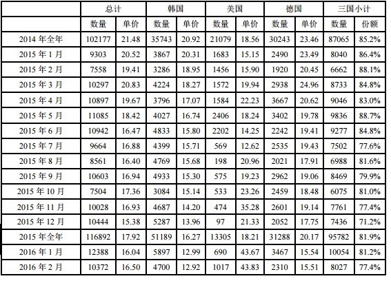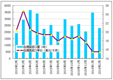 2016年2月份從德國進口多晶硅量為2310噸,環(huán)比減少33.4%;2月份進口單價創(chuàng)歷史新低至15.51美元/千克,環(huán)比跌幅為0.19%。