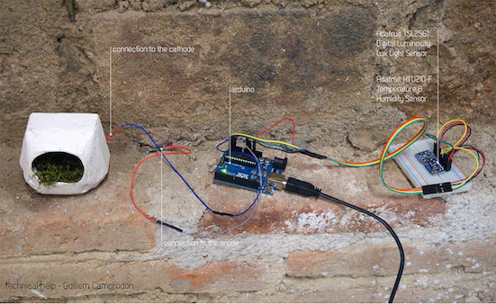 除此之外,一個苔蘚發(fā)電單位面積為100×100毫米,一單位的發(fā)電量為0.35伏特。混合炭纖維和水凝膠的陽極(切得既小又。┰诘牧⒎襟w中,有一層碳織物以及被苔蘚掩蓋的混合物。該發(fā)電系統(tǒng)還配有一個監(jiān)測裝置,內設傳感器,每5秒自動檢測內部環(huán)境的勒克斯(光照單位)、濕度、溫度和電壓等指數,并即時保存數據。
