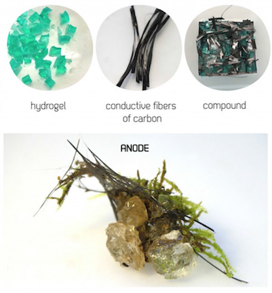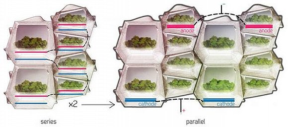 一個苔蘚發(fā)電單位就是一個完整的生物電運行系統(tǒng),由陽極生物材料(苔蘚)、陽極、陰極、陰極催化劑、允許正電荷(主要是質子)從陽極生物材料向陰極轉移的“鹽橋”組成。陽極即水凝膠和導電碳纖維組成的無土基質,水凝膠是一種可吸收其自身重量400倍的水分的聚合物,能與苔蘚濕度互補。發(fā)電系統(tǒng)中物質均不會破壞苔蘚的代謝運動。
